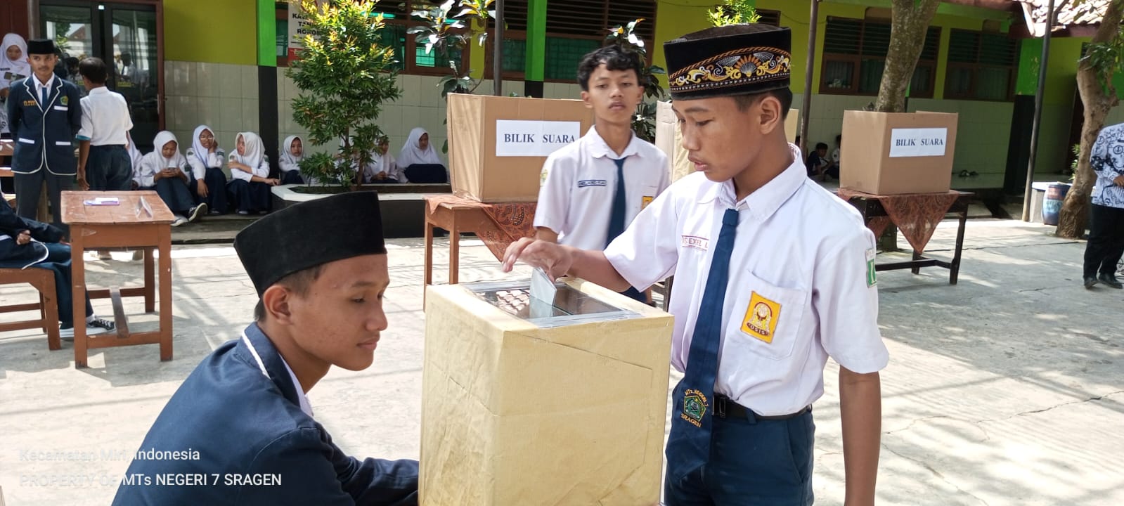 Sragen (Humas) – MTsN 7 Sragen menyelenggarakan pesta demokrasi dalam pemilihan ketua dan wakil ketua OSIM masa bakti 2025-2026 di halaman madrasah pada Selasa (25/11). Kegiatan ini diikuti seluruh keluarga besar MTsN 7 Sragen. Guru, pegawai, dan siswa-siswi MTsN 7 Sragen antusias memilih calon ketua dan wakil ketua OSIM sesuai hati nuraninya.