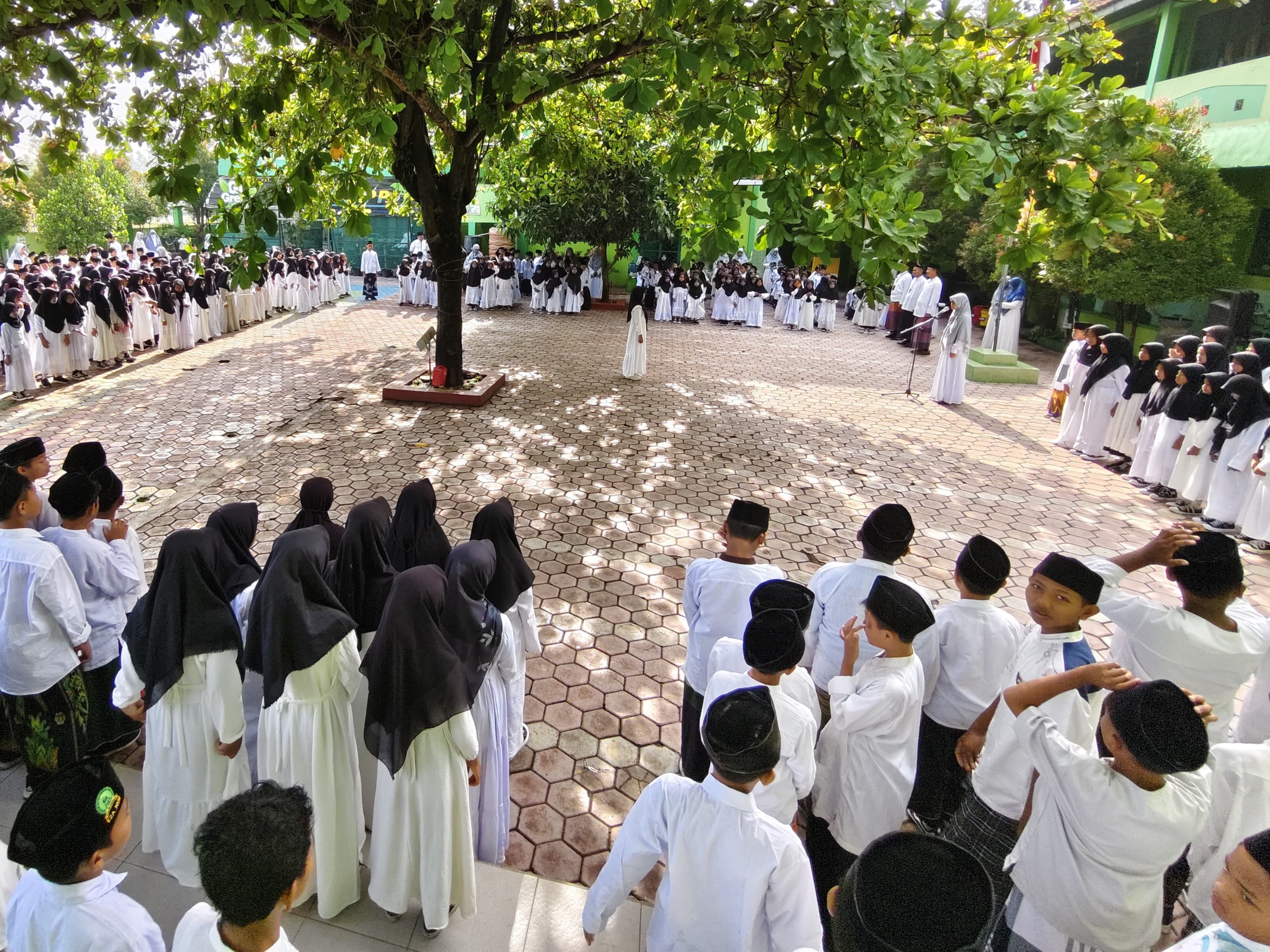 Sumberlawang (Humas) – Suasana khidmat dan penuh keceriaan mewarnai halaman MIN 5 Sragen pada Rabu (22/10). Dalam rangka memperingati Hari Santri Nasional, seluruh guru dan peserta didik mengikuti apel pagi dengan mengenakan busana bernuansa santri. Para siswa putra tampil rapi dengan koko, sarung, dan peci, sementara siswa putri anggun dalam busana muslimah putih berjilbab hitam.