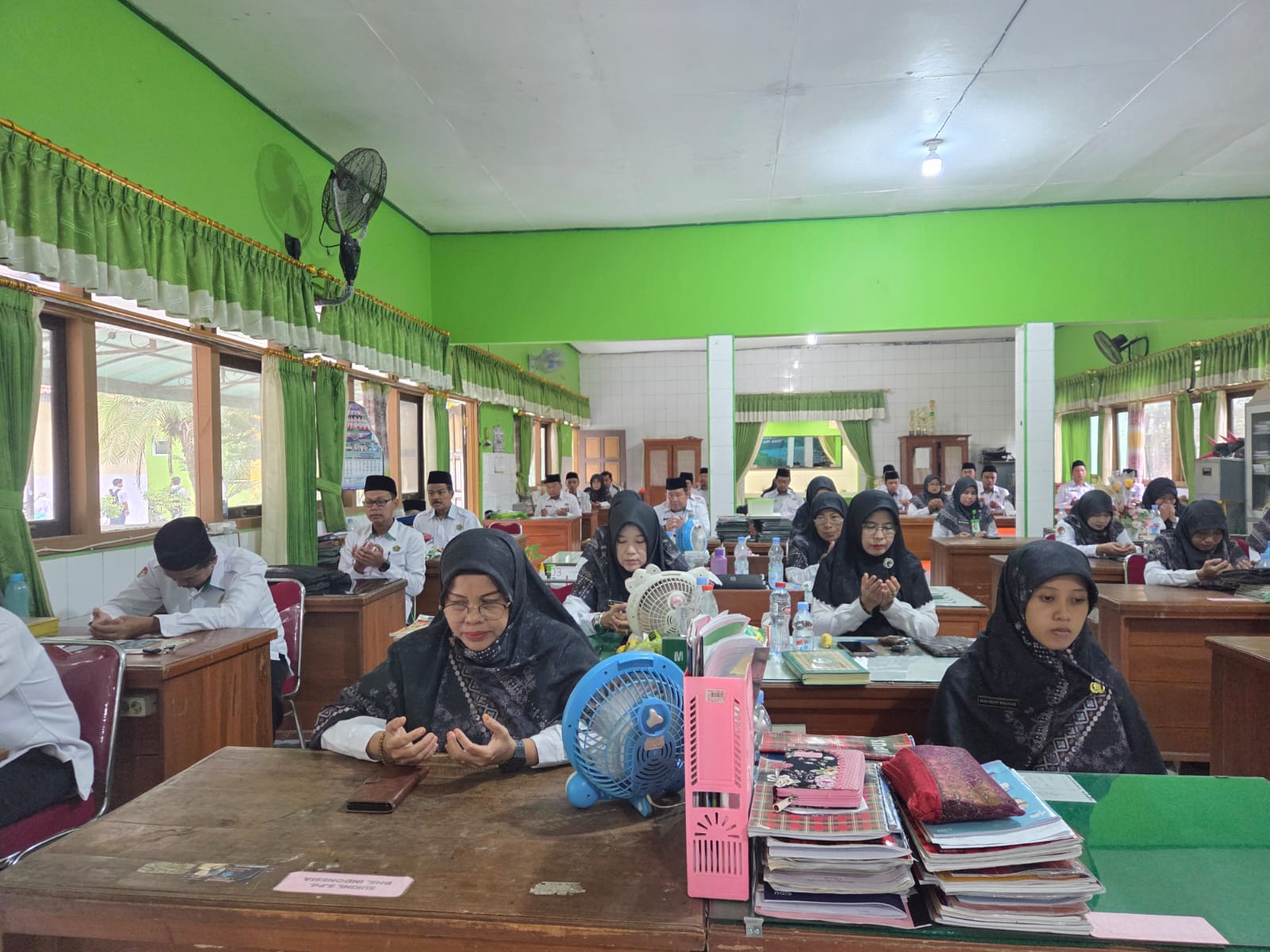 Sragen (Humas)- MTsN 2 Sragen mulai membiasakan pelaksanaan doa pagi bersama guru dan pegawai mulai Senin (9/2). Kegiatan ini dilaksanakan setiap pagi sebelum Kegiatan Belajar Mengajar (KBM) dimulai dan bertempat di ruang guru MTsN 2 Sragen.