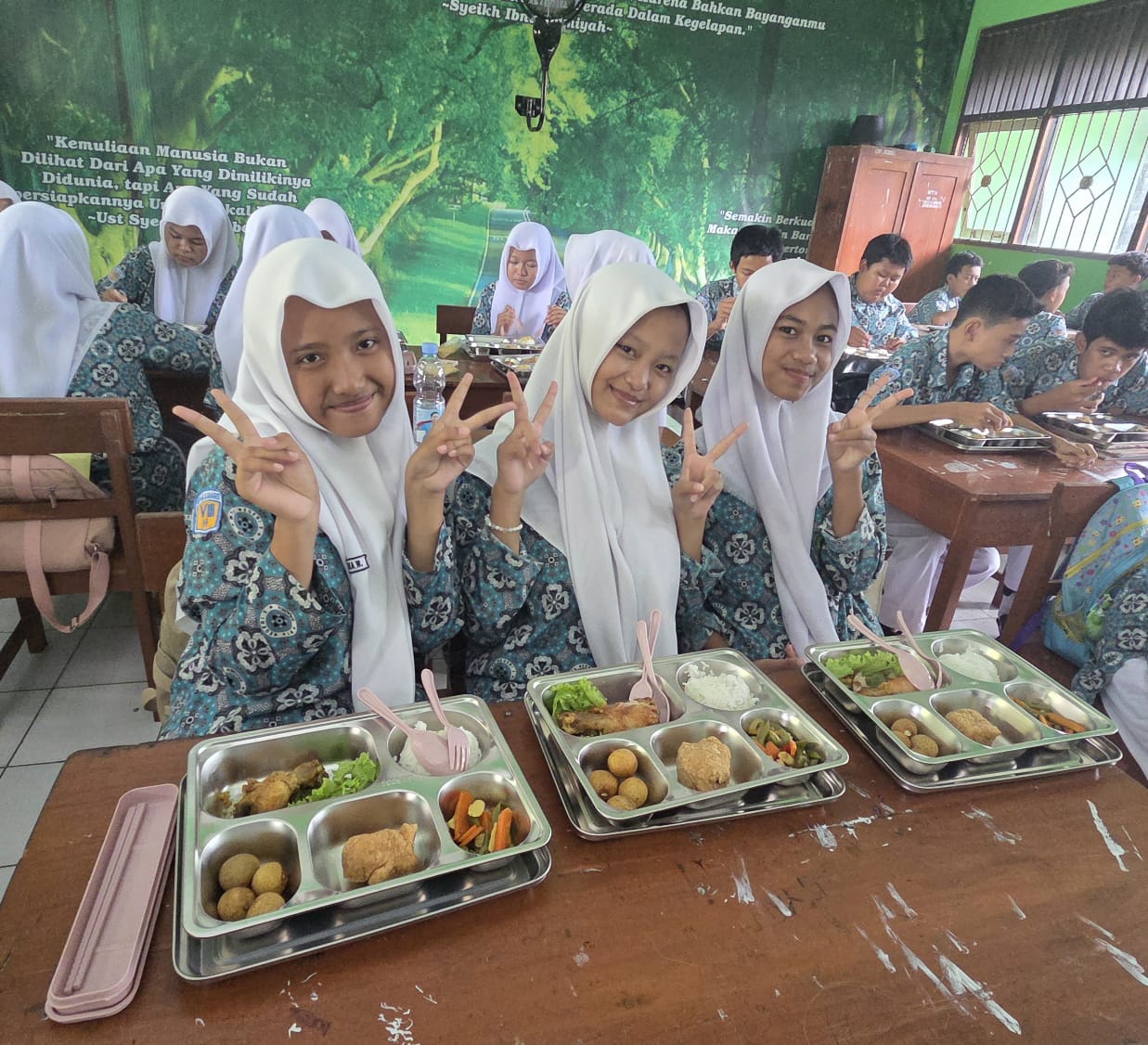 Antusiasme siswa pun terlihat jelas. Salah satunya Tsalsa Afivah 8H, yang mengaku sangat menikmati MBG hari pertama. “Rasanya enak sekali, apalagi bisa makan bersama teman-teman. Saya jadi lebih semangat belajar setelah makan. Menunya juga berbeda dengan yang biasanya saya bawa dari rumah, jadi terasa spesial,” ungkapnya dengan wajah gembira.