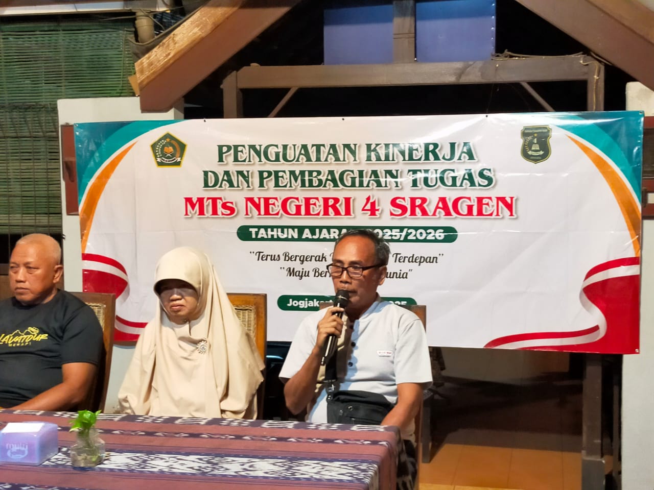 Kegiatan diawali oleh arahan Kepala MTsN 4 Sragen, Sardi, yang menyampaikan terkait dengan tujuan dan sasaran yang ingin dicapai pada tahun pelajaran 2025/2026. Sardi megingatkan pentingnya memupuk kerja sama yang kompak dan membangun komunikasi efektif di lingkungan guru dan pegawai agar tujuan bersama dapat dicapai dengan sukses.