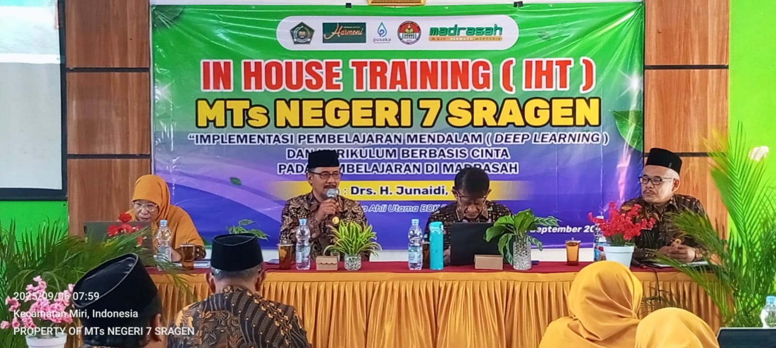 Sragen (Humas) – MTsN 7 Sragen menyelenggarakan kegiatan In House Training (IHT) bertajuk “Imolementasi Pembelajaran Mendalam dan. Kurikulum Berbasis Cinta” pada Sabtu (6/9) dengan melibatkan seluruh guru dan pegawai, serta menghadirkan Junaidi, Widyaiswara Ahli Utama dari Balai Dijlat Keagamaan Semarang.